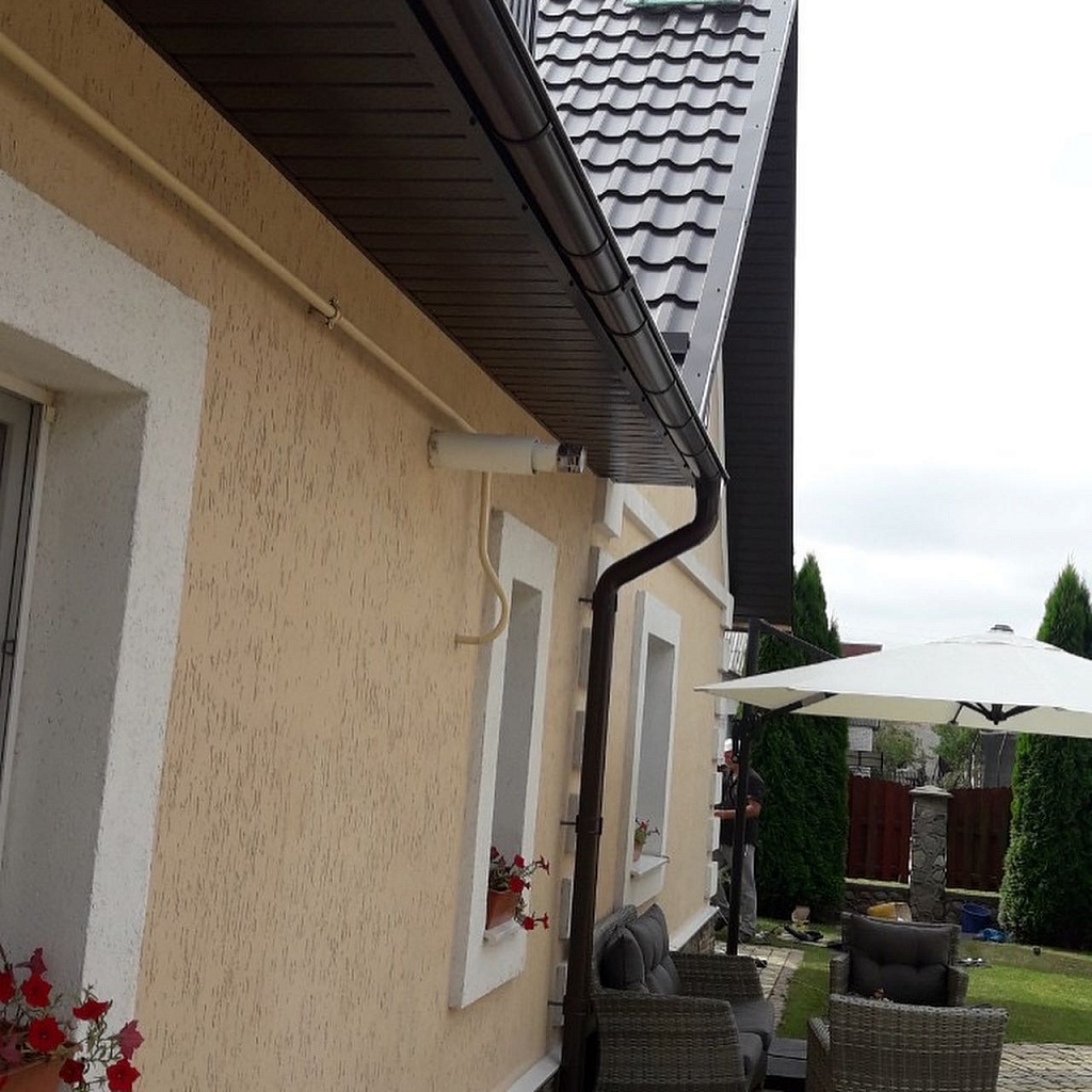 • Установка карнизных планок из металла в цвет кровли. Защиту краев обрешеточного бруса от воздействия внешней среды обеспечивают карнизные панели. Монтируются панели на подкладку внахлест с перекрытием на 20 мм и фиксируются гвоздями. Шаг крепления – 100 мм;